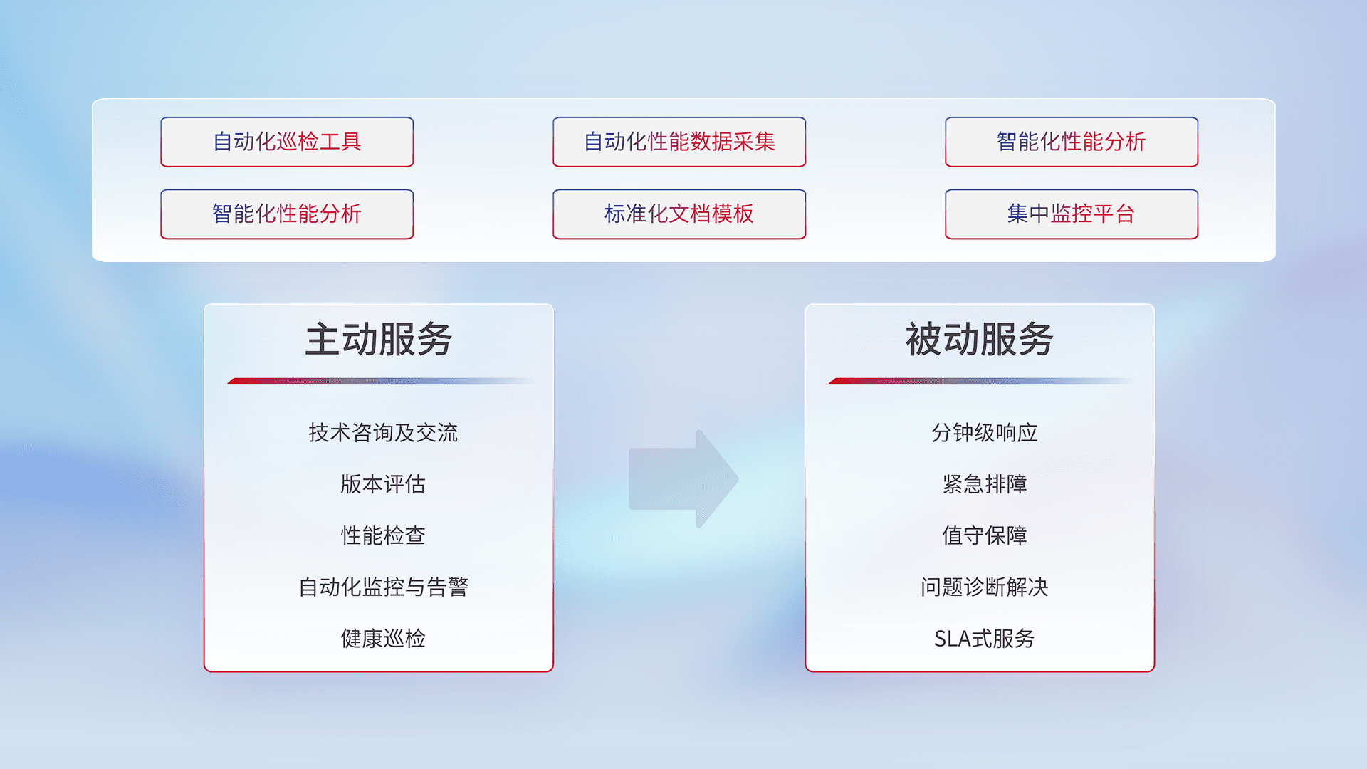 智能化工具和标准化文档,,保障服务质量,,提供主动服务(包含技术咨询、、、版本评估、、性能检查、、、自动化监控与告警、、、健康巡检)和被动服务包含(分钟级响应、、、、紧急排障、、、值守保障、、、问题诊断解决、、SLA服务)。。
